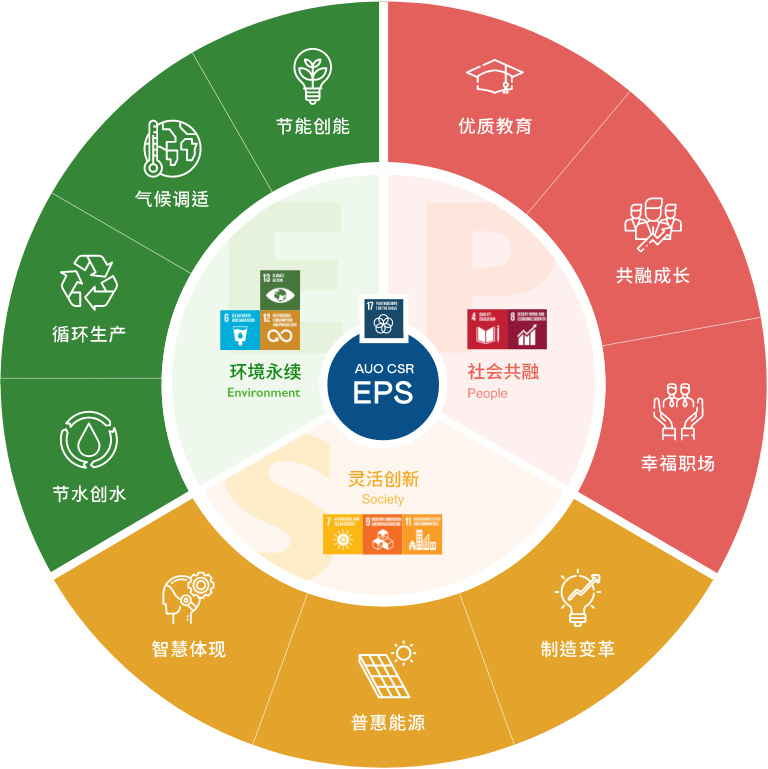 根据联合国所发展的17项永续发展目标,PT电子(中文)官网光电以「超越企业社会责任,创造共享价值」为企业永续愿景发展蓝图,订出环境永续、共融成长与灵活创新的EPS(Environment, People & Society)三大永续发展主轴;以响应日益受关切的环境议题与社会共融趋势。