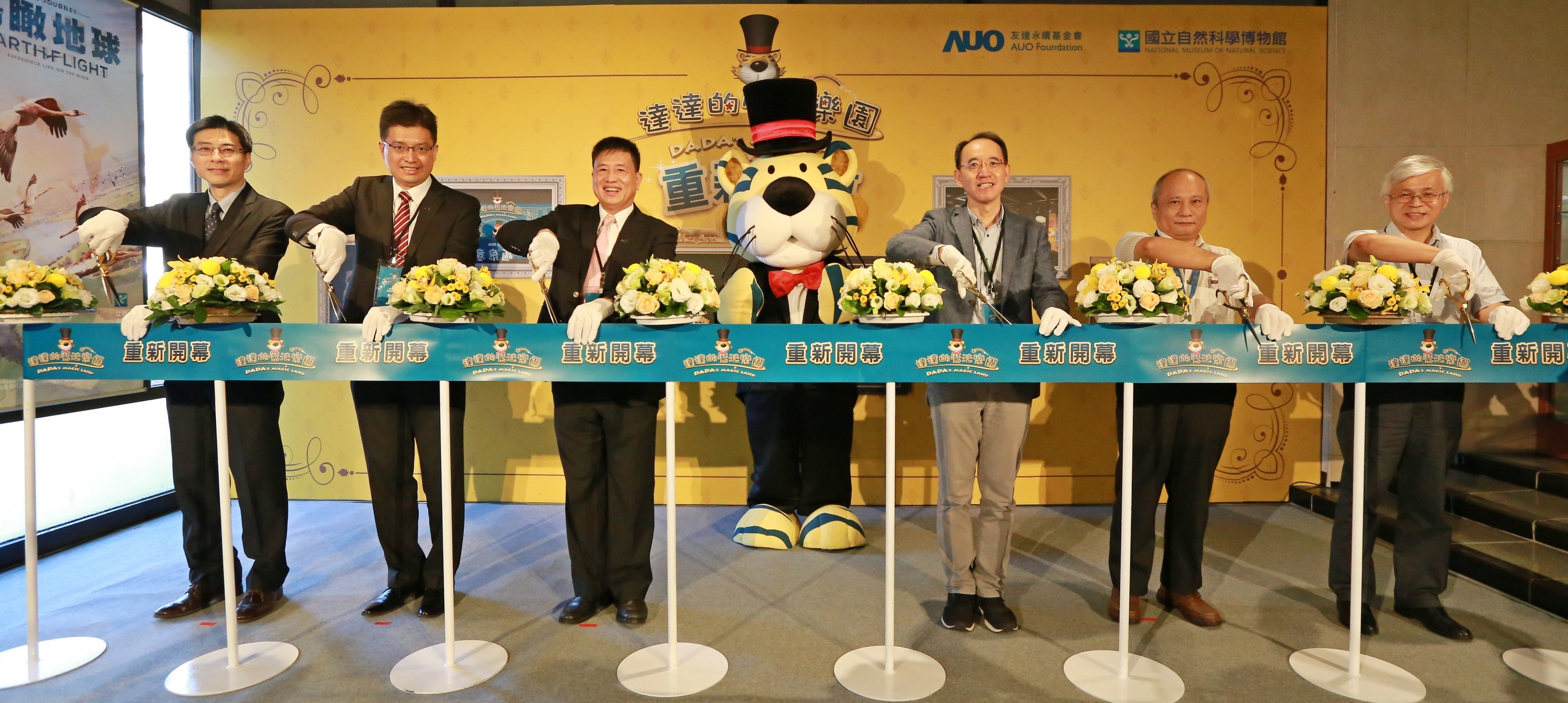 PT电子(中文)官网永續基金會董事長彭双浪 (左三) 以及科博館館長焦傳金 (左四) 共同舉行達達的魔法樂園重新開幕儀式